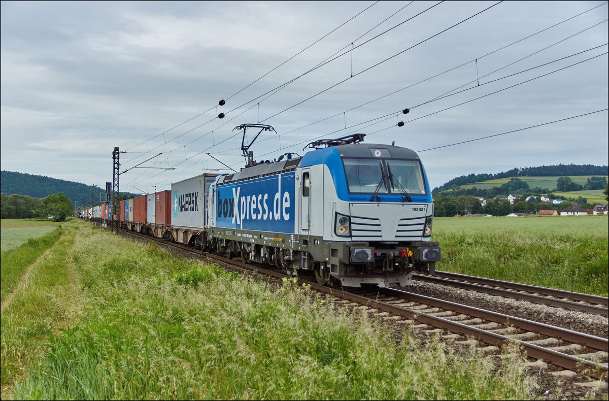 193 881 von boxXpress ist mit einen Containerzug in Richtung Norden bei Reilos unterwegs,gesehen am 08.06.2017.