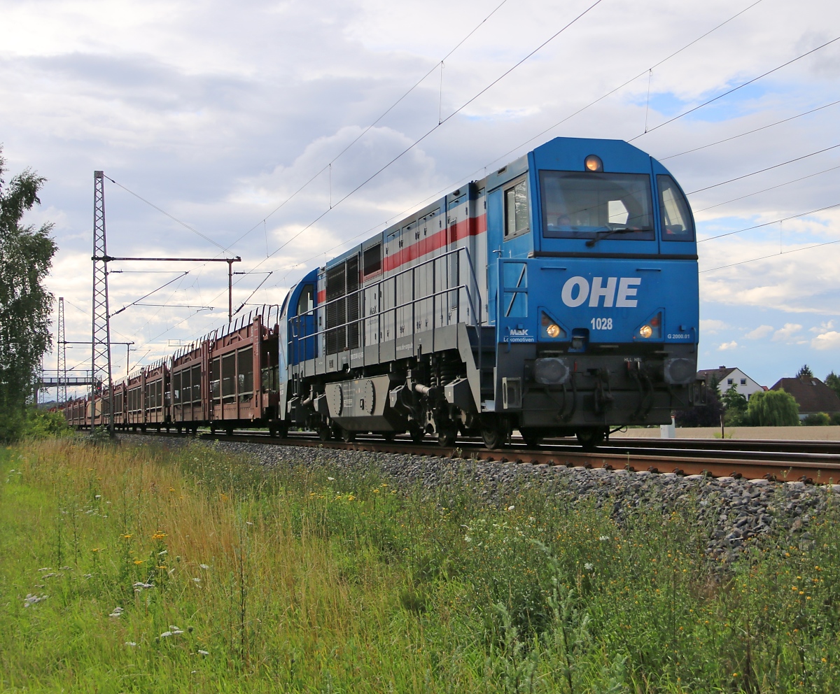273 001 (OHE 1028) mit leeren Autotransportwagen in Fahrtrichtung Seelze. Aufgenommen in Dedensen-Gümmer am 29.07.2015.