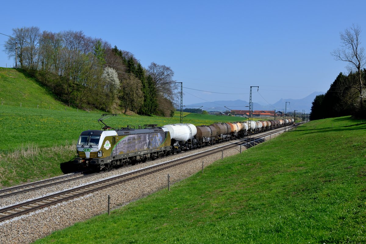 Am 09. April 2017 brachte die SETG 193 240 den Schlammkreidezug DGS 49878 von Frailassing nach Plattling. Bei Straß konnte ich diese an Sonntagen sehr verläßlich verkehrende Leistung aufnehmen. Im Hintergrund erkennt man die Salzburger Hausberge.