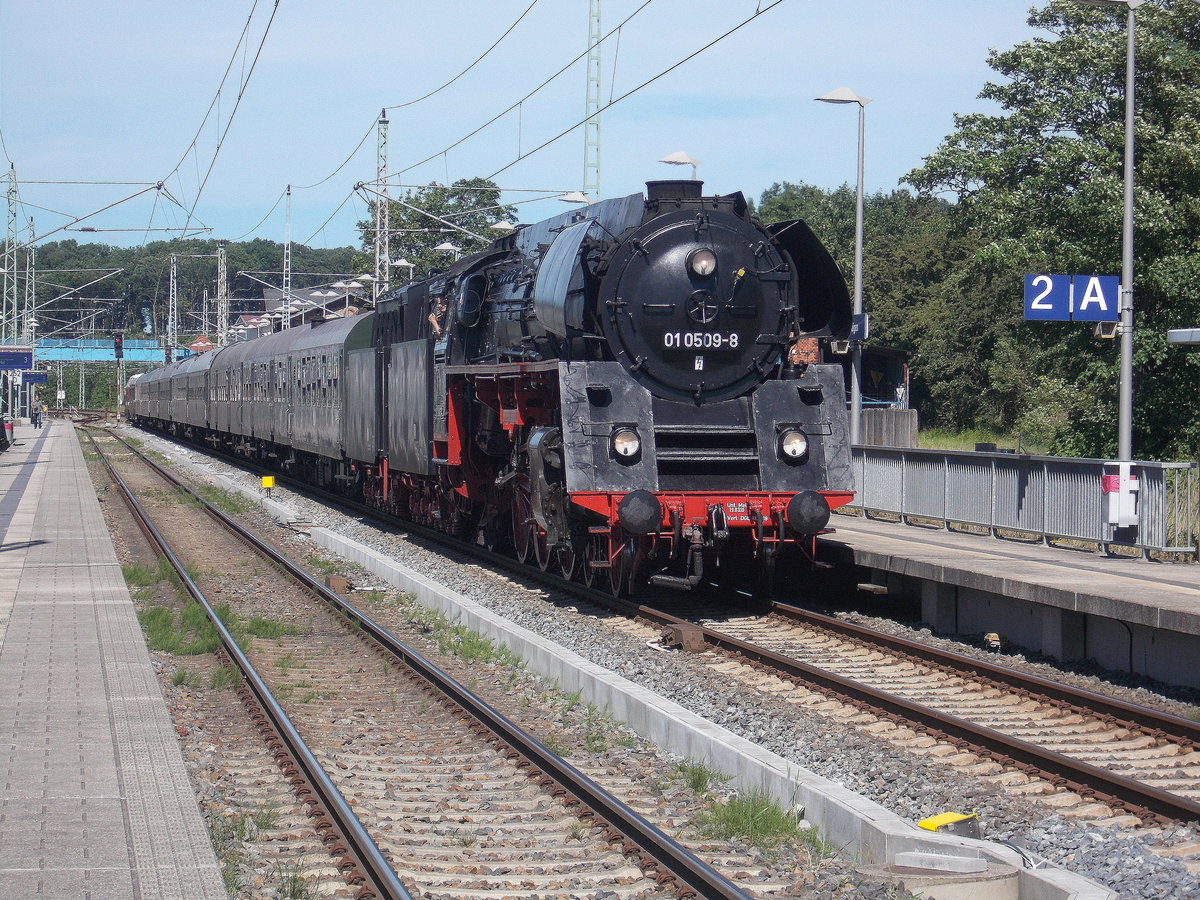 Auf Grund das in Bergen/Rügen Ausfahrten Richtung Putbus nur über die Gleise 1 und 2 möglich sind mußte die 01 0509,am 10.Juni 2017,über Gleis 2 ausfahren.