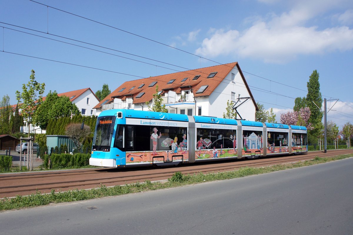 Straßenbahn Mainz: Adtranz GT6M-ZR der MVG Mainz - Wagen 203, aufgenommen im April 2017 in der Nähe der Haltestelle "Bismarckplatz" in Mainz.