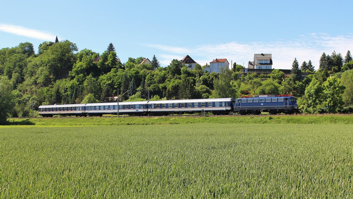 110 428-0 (TRI) fuhr am 11.06.17 von Stuttgart Hbf nach Delitzsch. Hier ist der Zug in Kahla zu sehen.