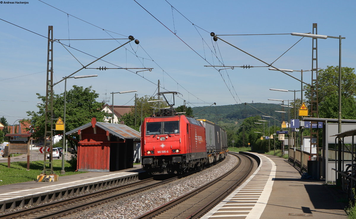 Am 07.06.2017 nähert sich 185 271 mit einem KLV-Zug in Richtung Basel dem Abzweig Brunnenstück südlich von Karlsruhe bei Rüppur.