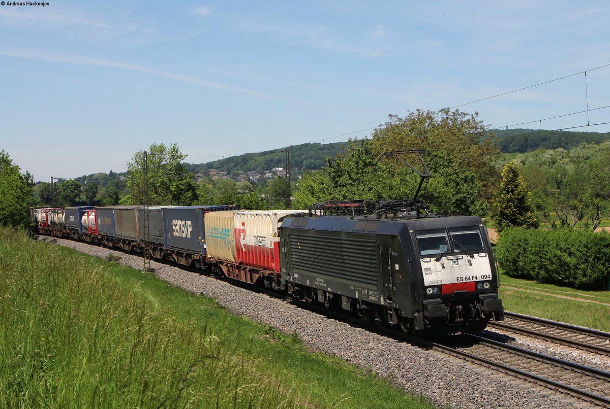 Am 07.06.2017 nähert sich 189 984 von MRCE vermietet an SBB Cargo International mit einem KLV-Zug dem Abzweig Brunnenstück südlich von Karlsruhe bei Rüppur.