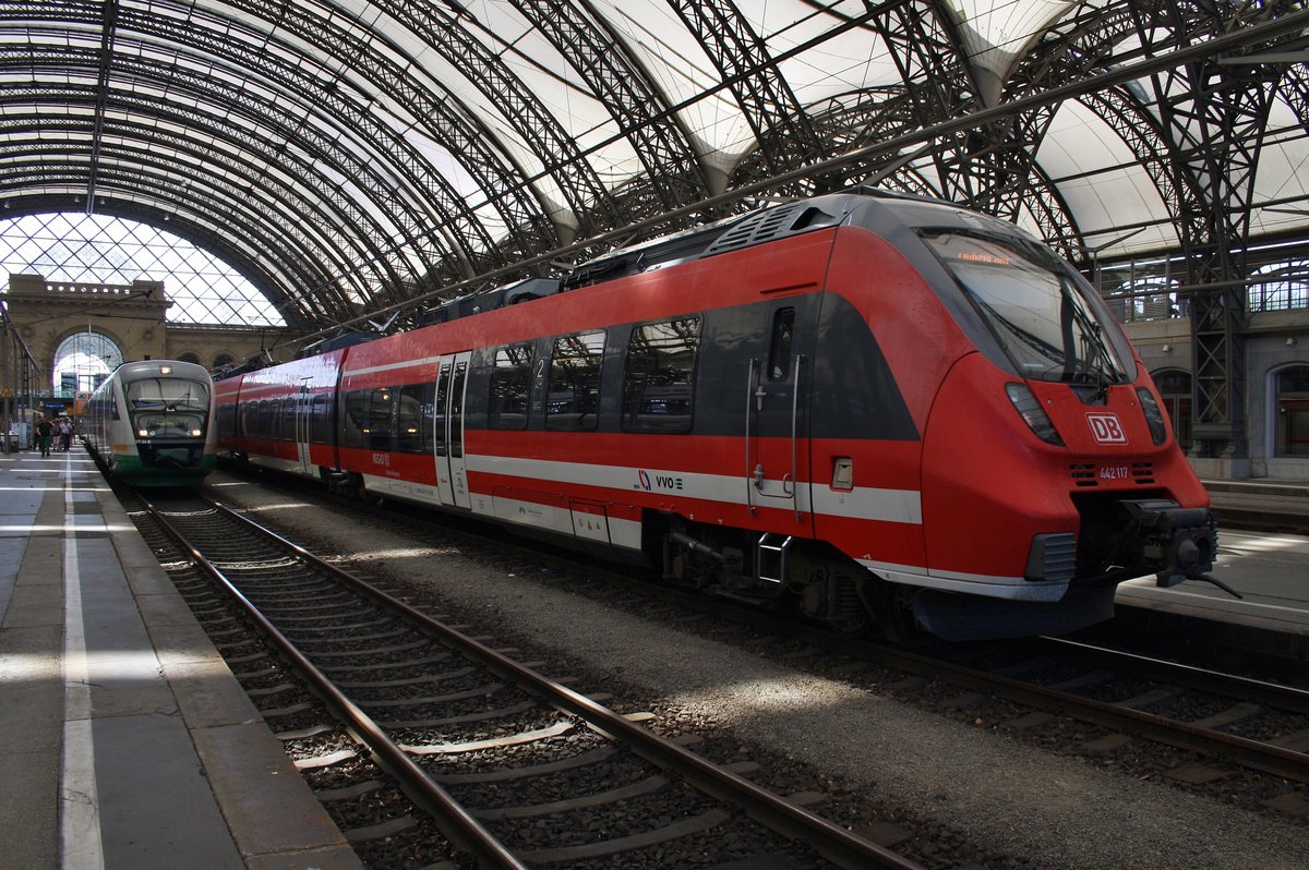 442 117-8 und 442 618-5 stehen am 27.5.2017 als RE50 (RE16512) "Saxonia" nach Leipzig Hauptbahnhof im Dresdener Hauptbahnhof bereit.