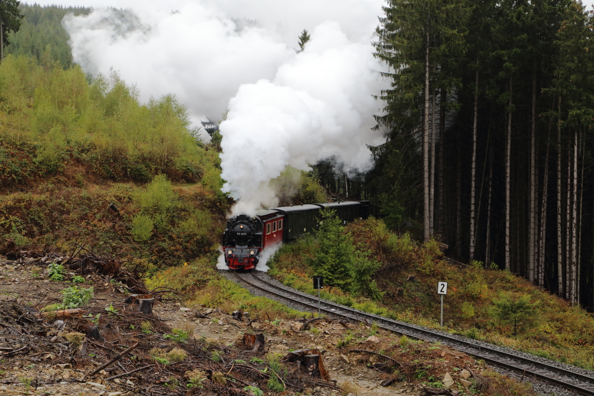 99 6001 erreicht mit ihrem IG HSB-Sonderzug zum Brocken, bei einer Scheinanfahrt am Mittag des 21.10.2016, gerade die bei einem schweren Sturm im Februar des Jahres entstandene, große Windbruchstelle am Drängetal. Vor genanntem Ereignis waren Aufnahmen an dieser Stelle wegen des dichten Baumbewuchses kaum möglich.