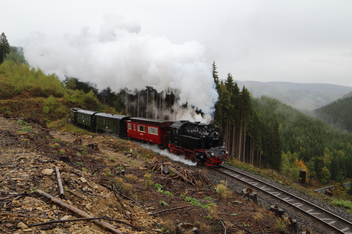 99 6001 passiert am 21.10.2016 mit ihrem IG HSB-Sonderzug zum Brocken die Windbruchstelle am Drängetal. (Scheinanfahrt)