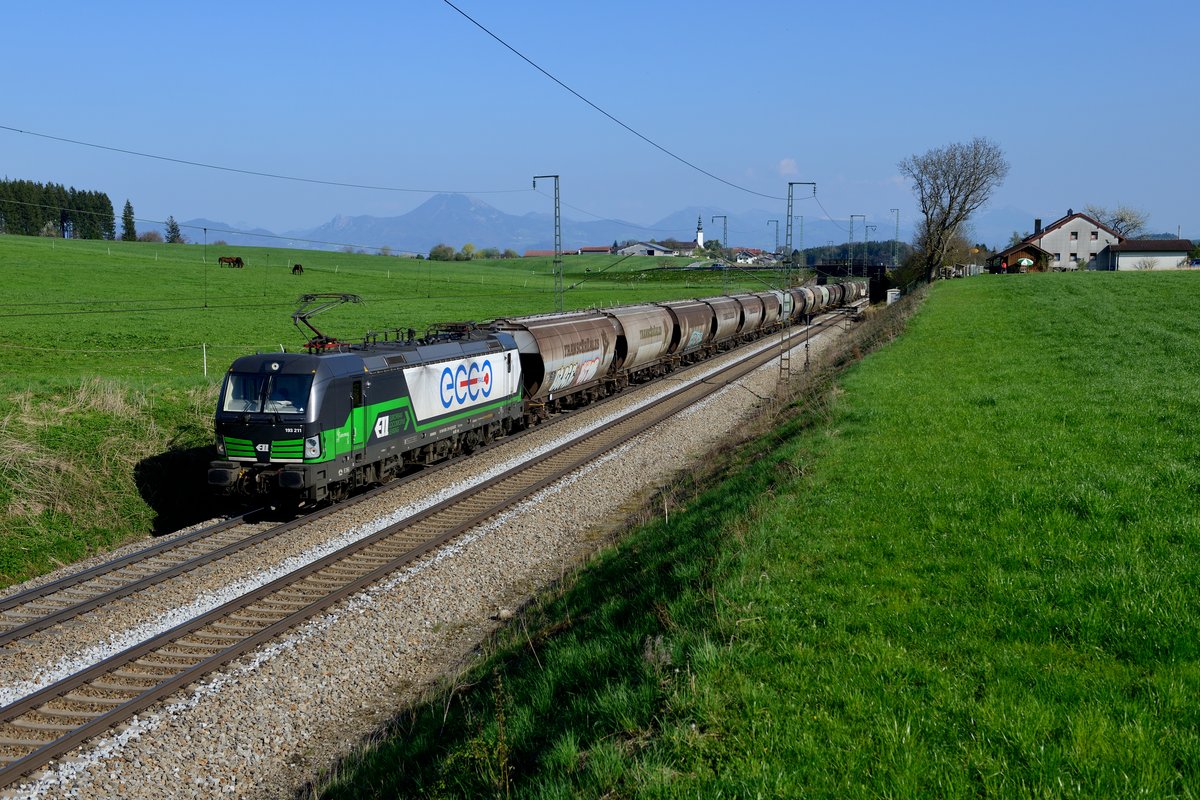Bei Hörafing wurden weitere über die KBS 951 umgeleitete Güterzüge abgewartet. Zunächst kam ein für die Passauer Bahn typischer Getreidezug. Die für ecco rail fahrende 193 211 brachte den DGS 45194 westwärts (09. April 2017).