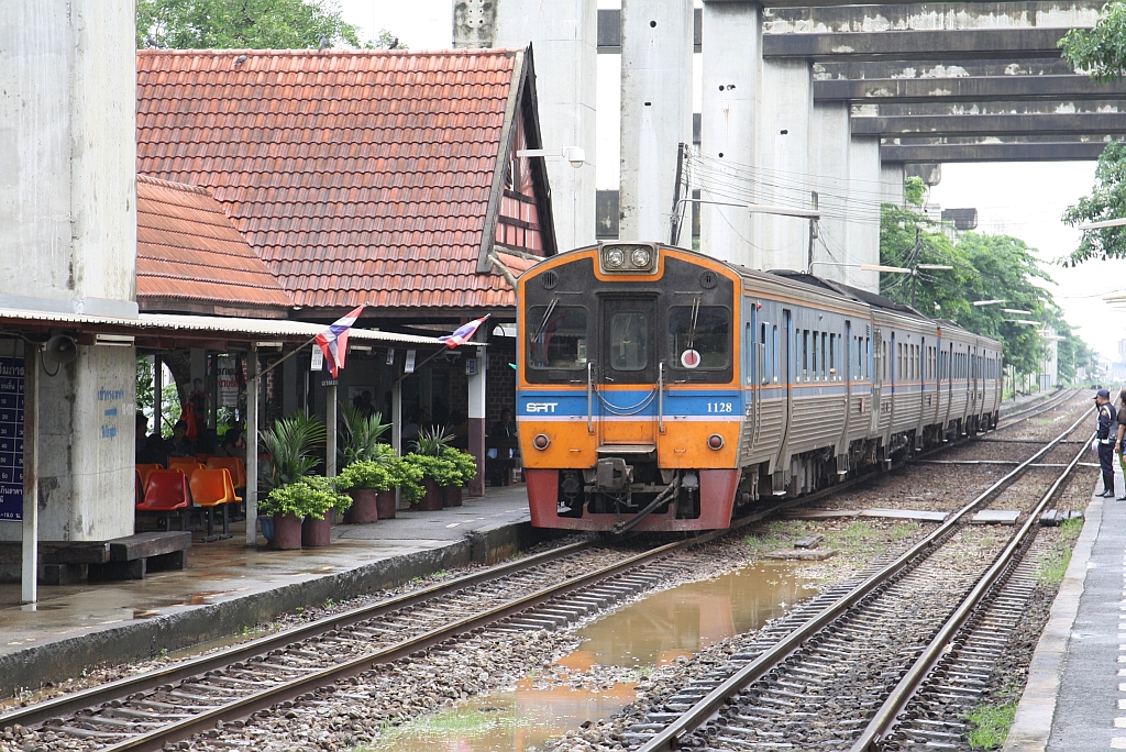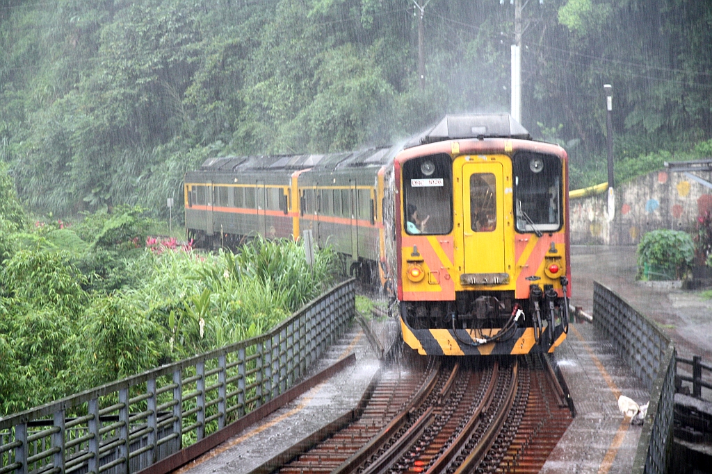 DRC1027 als letztes Fahrzeug des Local Train 4718 verlässt bei strömenden Regen am 02.Juni 2017 die Pingxi Station. Der Local Train 4718 war der letzte Zug der an diesem Tag noch bis zur Endstelle der Pingxi Line der Jingtong Station fuhr. Ca. 1 Stunde später wurde der Verkehr auf der Pinxi Line wegen der stärksten Niederschläge seit 19 Jahren (664mm/24h bzw. 1002mm/48h) eingestellt.