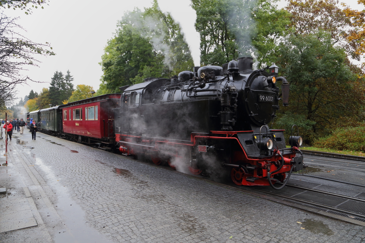 Soeben ist am 21.10.2016 99 6001 mit ihrem IG HSB-Sonderzug auf Gleis 1 im Bahnhof Drei Annen Hohne eingelaufen. Bevor es weiter zum Brocken geht, erfolgt das obligatorische Wasserfassen.