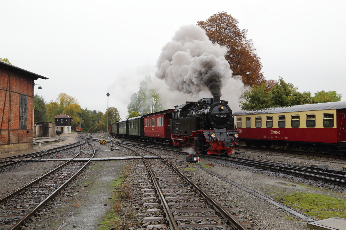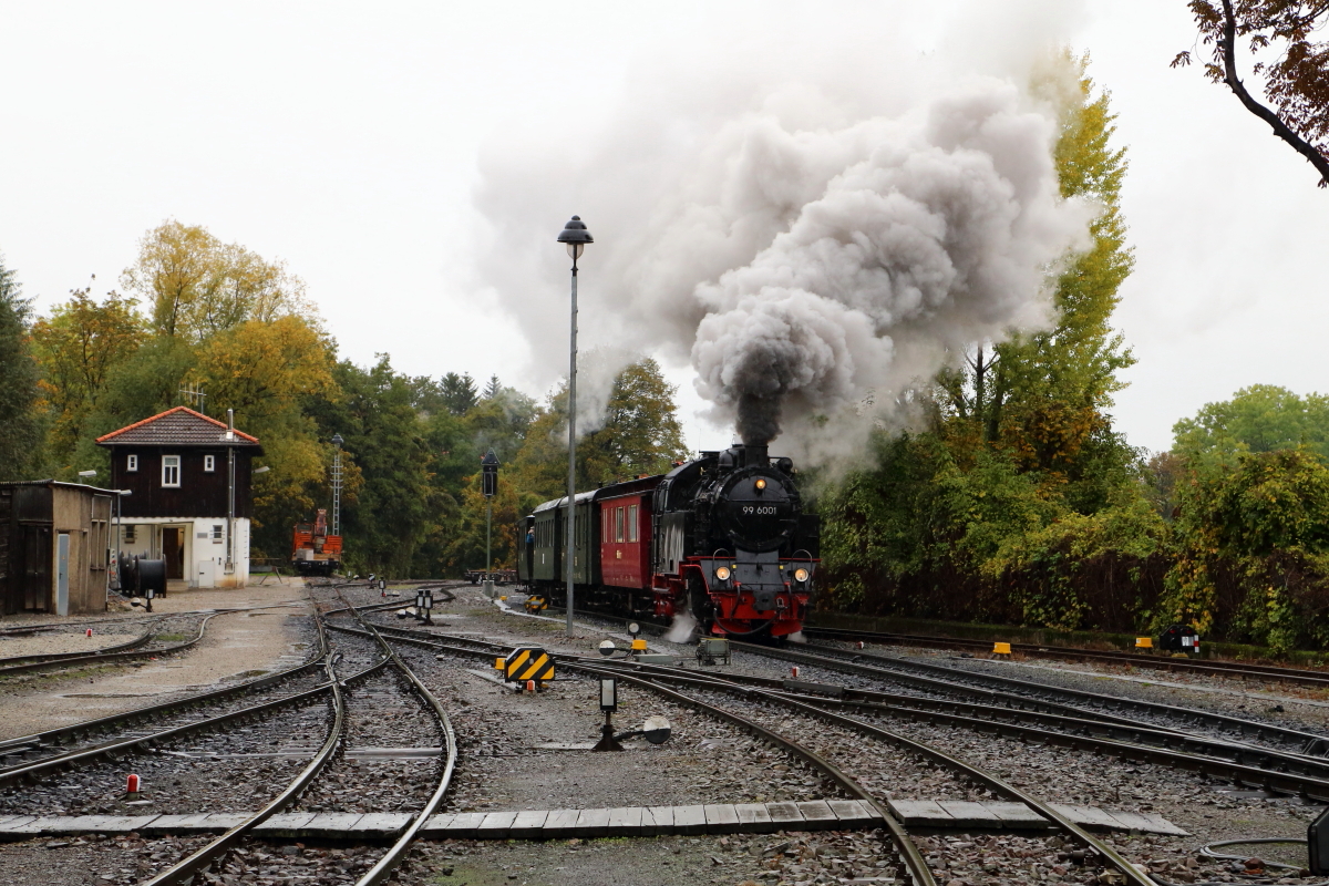 Vom 21.-23.10.2016 fand die nun schon traditionelle Herbstveranstaltung der IG HSB statt. Der erste Zug fuhr, wie gewohnt, von Wernigerode zum Brocken und zurück. Das Bild zeigt denselben, unter Traktion von 99 6001, bei der Einfahrt (Scheineinfahrt) in den Bahnhof Wernigerode-Westerntor, wobei gerade das HSB-Bw passiert wird. Die Aufnahme entstand aus offizieller Fotolinie im Rahmen genannter Veranstaltung. (Bild 2)