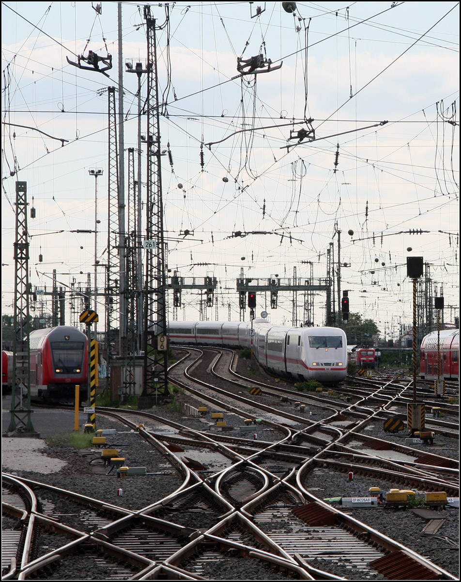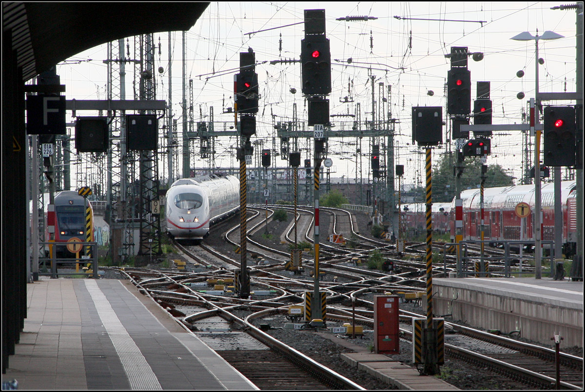 Gleisvorfeld des Frankfurter Hauptbahnhofes. Die 45-minütige Verspätung meines ICEs nach Stuttgart erlaubte das ein und andere Bild an diesem großen Bahnhof. Hier die Einfahrt eines ICE 1 aus Richtung Mannheim.