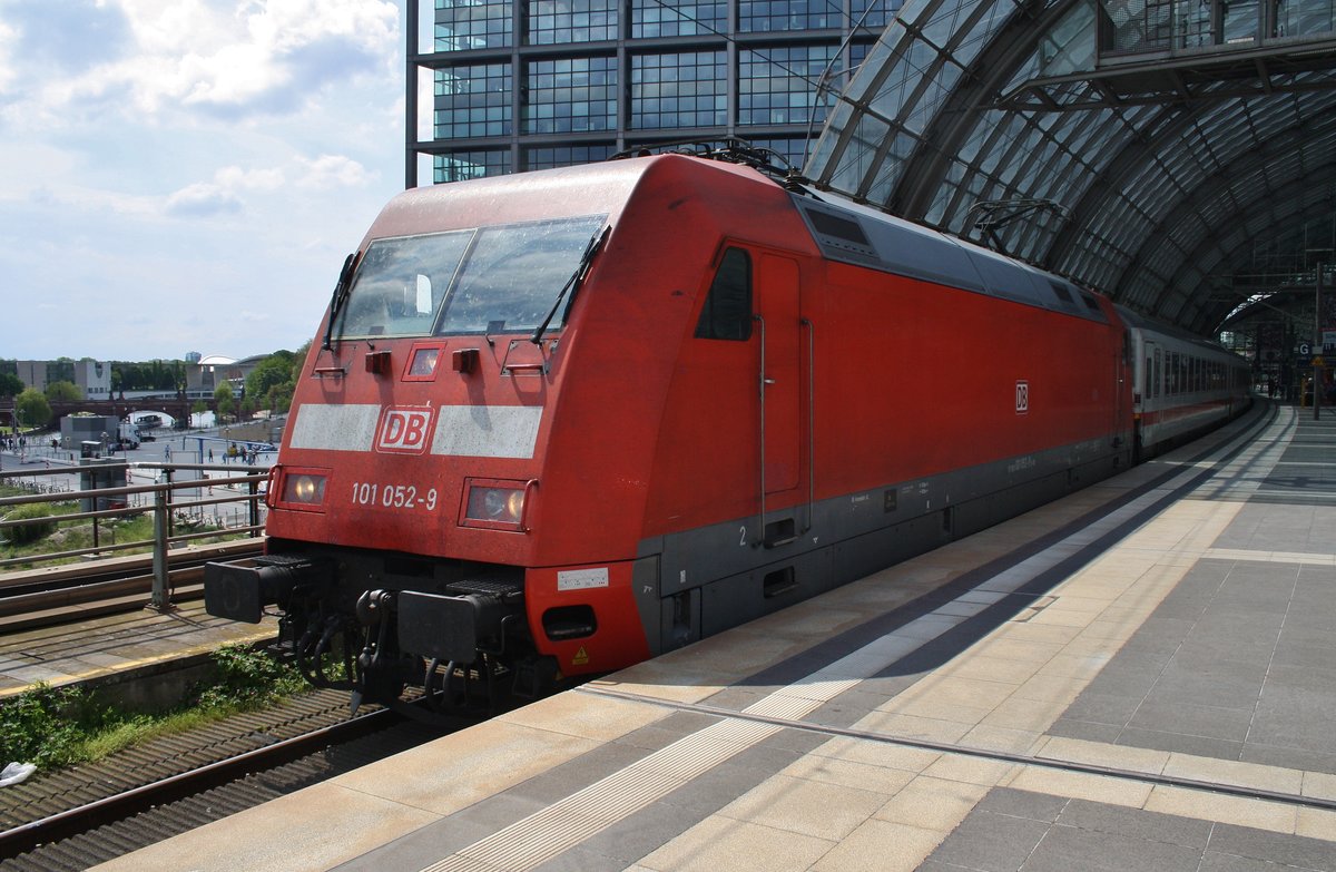 101 052-9 steht am 14.5.2017 mit dem IC141 von Amsterdam Centraal nach Berlin Ostbahnhof im Berliner Hauptbahnhof.