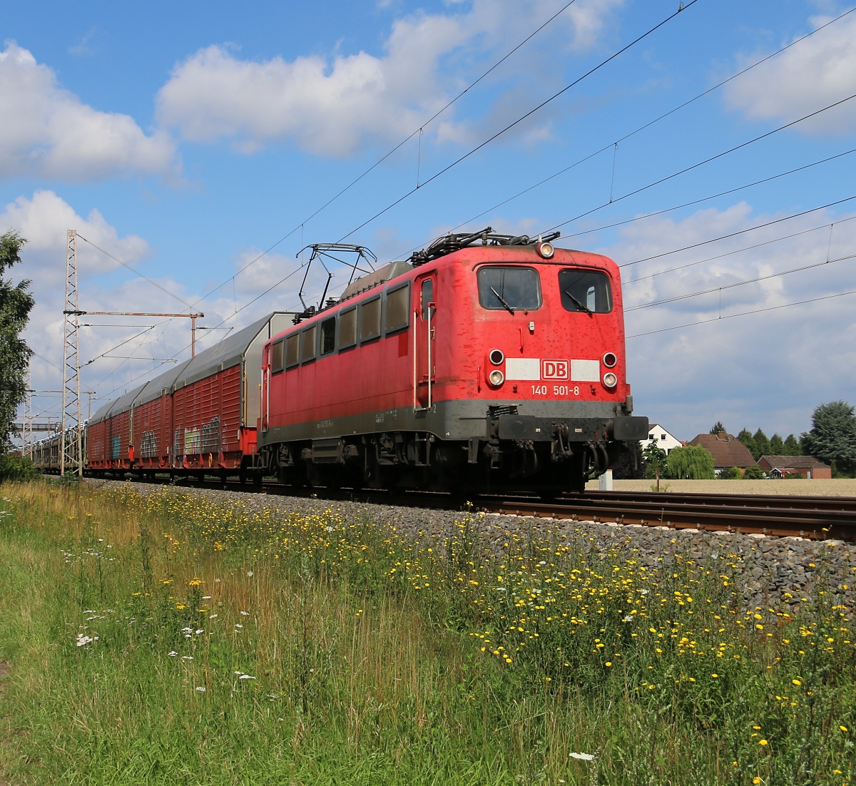 140 501-8 mit Autotransportzug in Fahrtrichtung Seelze. Aufgenommen in Dedensen-Gümmer am 29.07.2015.