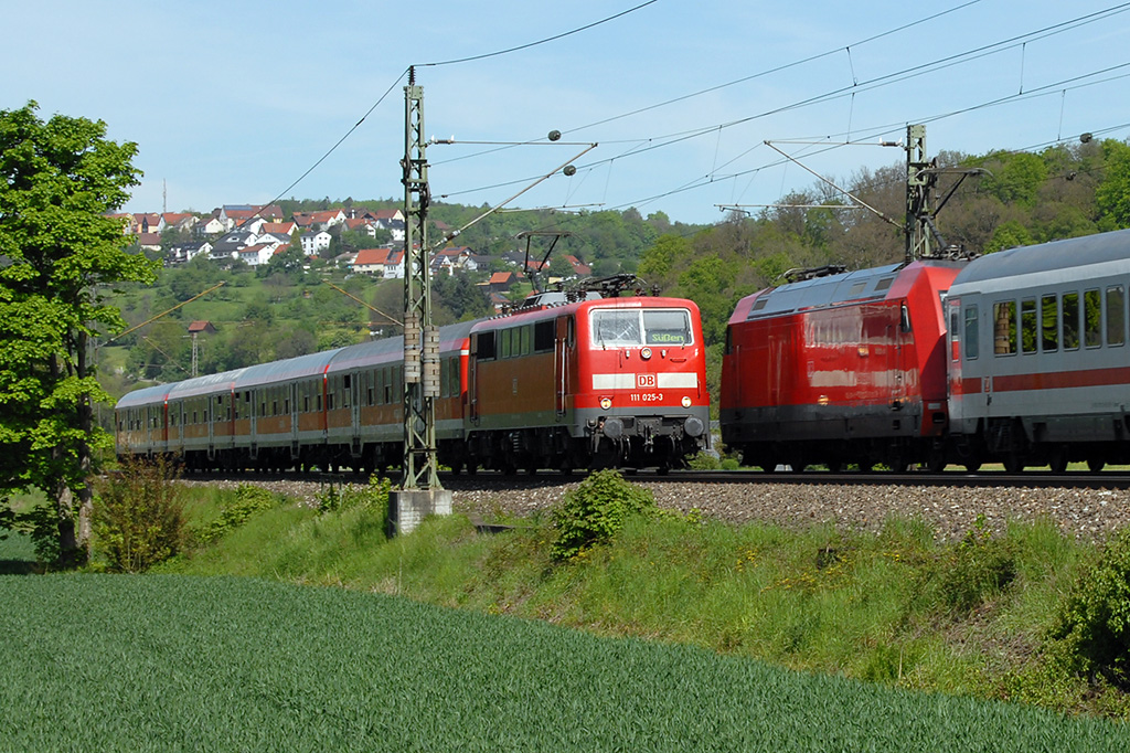 16.05.2017 Streckenabschnitt Uhingen, Spieglein, Spieglein auf dem Gegengleis ... 111 025-3 spiegelt ihr Antlitz in der Flanke der 101er