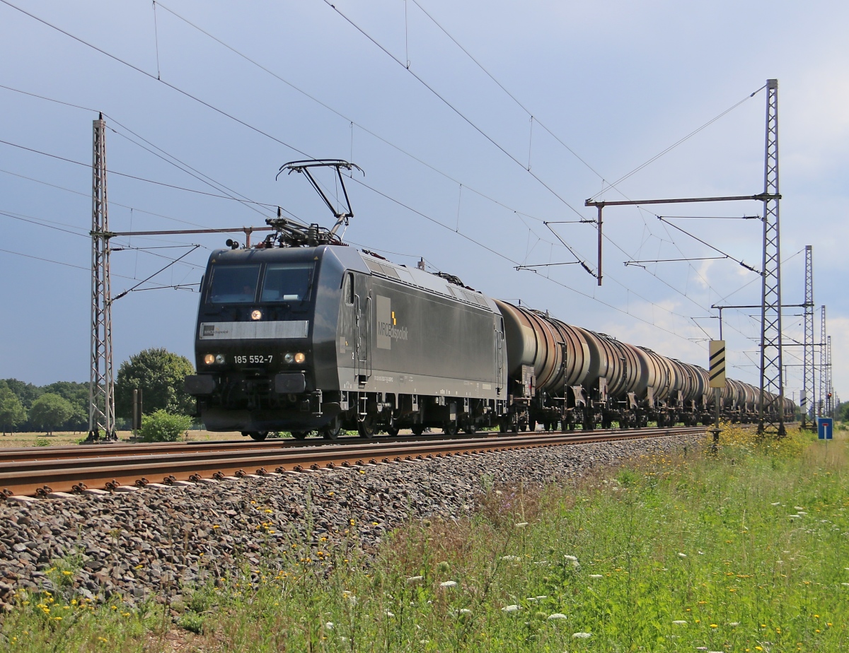 185 552-7 mit Kesselwagenzug in Fahrtrichtung Wunstorf. Aufgenommen am 29.07.2015 in Dedensen-Gümmer.