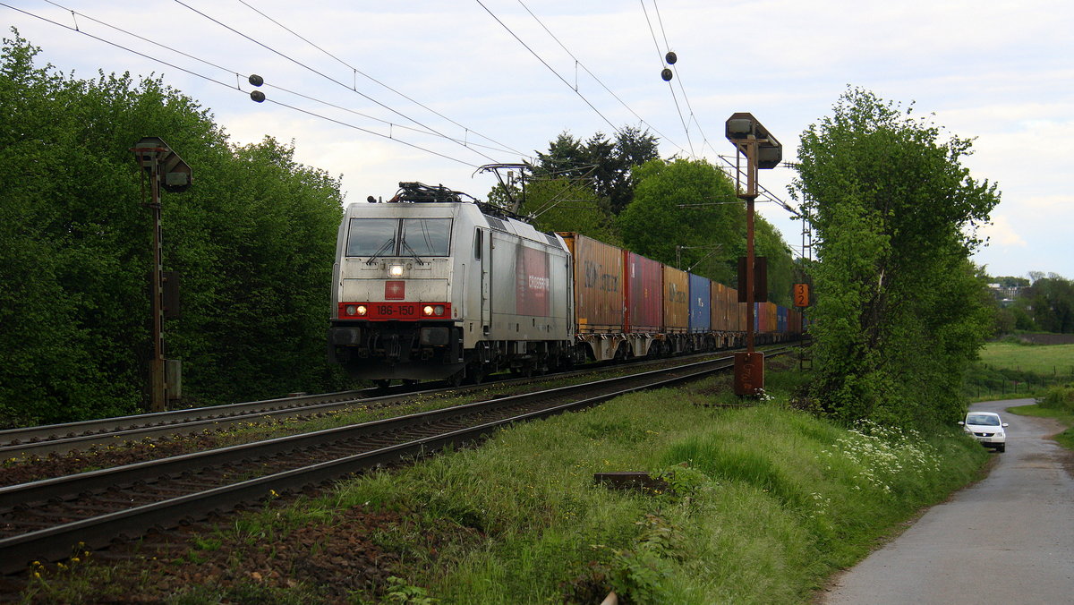 186 150 von Crossrail kommt die Gemmenicher-Rampe hochgefahren mit einem langen Containerzug aus Gallarate(I) nach Zeebrugge(B).