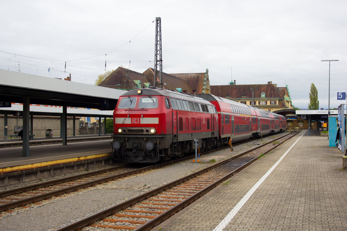 218 406-7 steht mit ihrem IRE nach Ulm Abfahrbereit im Lindauer Hbf. 1.5.17.