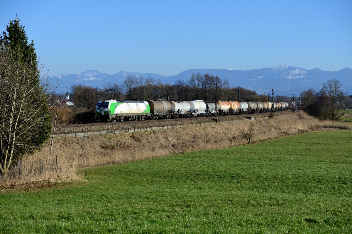 Am 12. März 2017 brachte die SETG 193 240 den Schlammkreidezug DGS 49878 von Frailassing nach Plattling. Bei Rann konnte ich die Leistung aufnehmen. Die gute Fernsicht erlaubte einen klaren Blick auf die Kampenwand. Links im Bild der Kirchturm von Großkarolinenfeld.