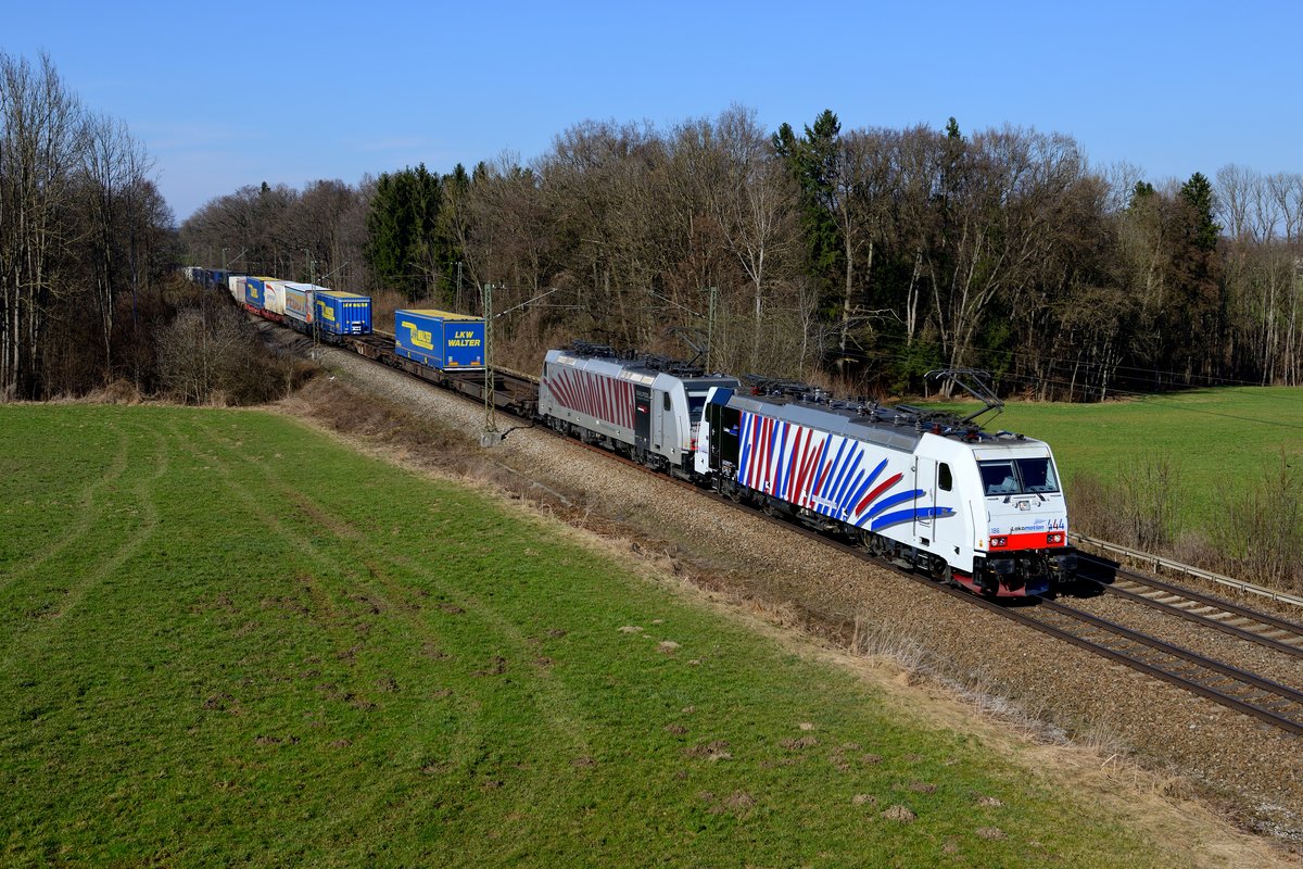 Auch wenn der DGS 43127 am 12. März 2017 nicht komplett beladen war, bei der frisch gewaschenen 186 444 habe ich gerne den Auslöser betätigt, als sie mit 186 282 und besagtem Zug die bekannte Brücke bei Gutmart passierte.