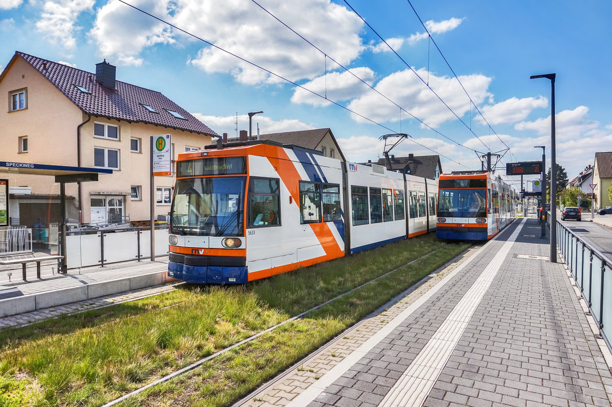 Der rnv-Tramwagen 5633, unterwegs war die Garnitur auf der Linie 4 (Oggersheim, Endstelle - Mannheim, Paradeplatz - Waldhof, Waldfriedhof).