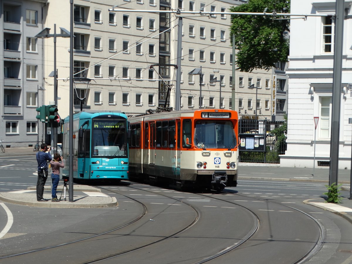 VGF Bombardier S-Wagen 222 trifft am 28.05.17 auf Düwag Pt Wagen 148