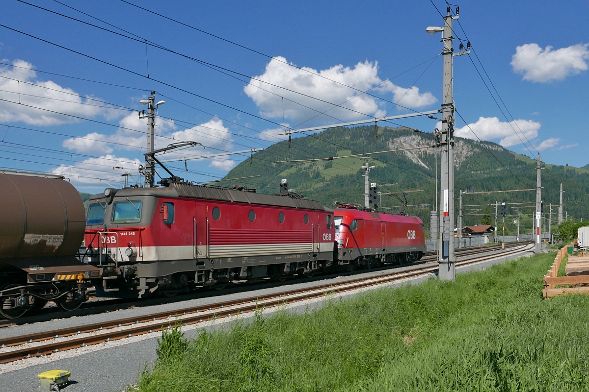1116 164-5 und 1144 248 durchfahren mit einem gemischten Güterzug aus Richtung Wörgl kommend am 27.05.2017 den Bahnhof von St. Johann in Tirol.