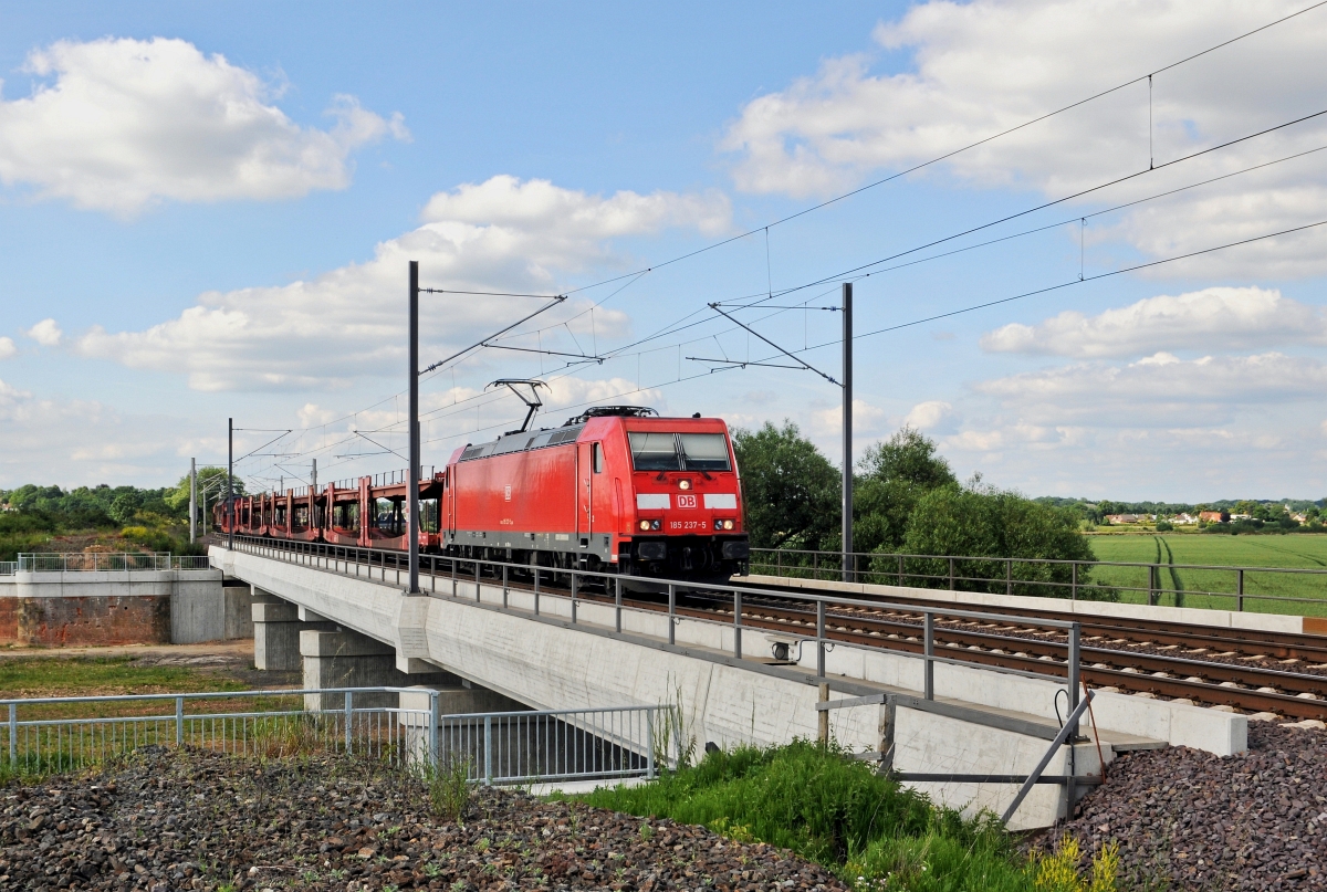 DB Cargo 185 237 mit leerem Autotransportzug in Richtung Hannover (Wahnebergen, 14.06.17).