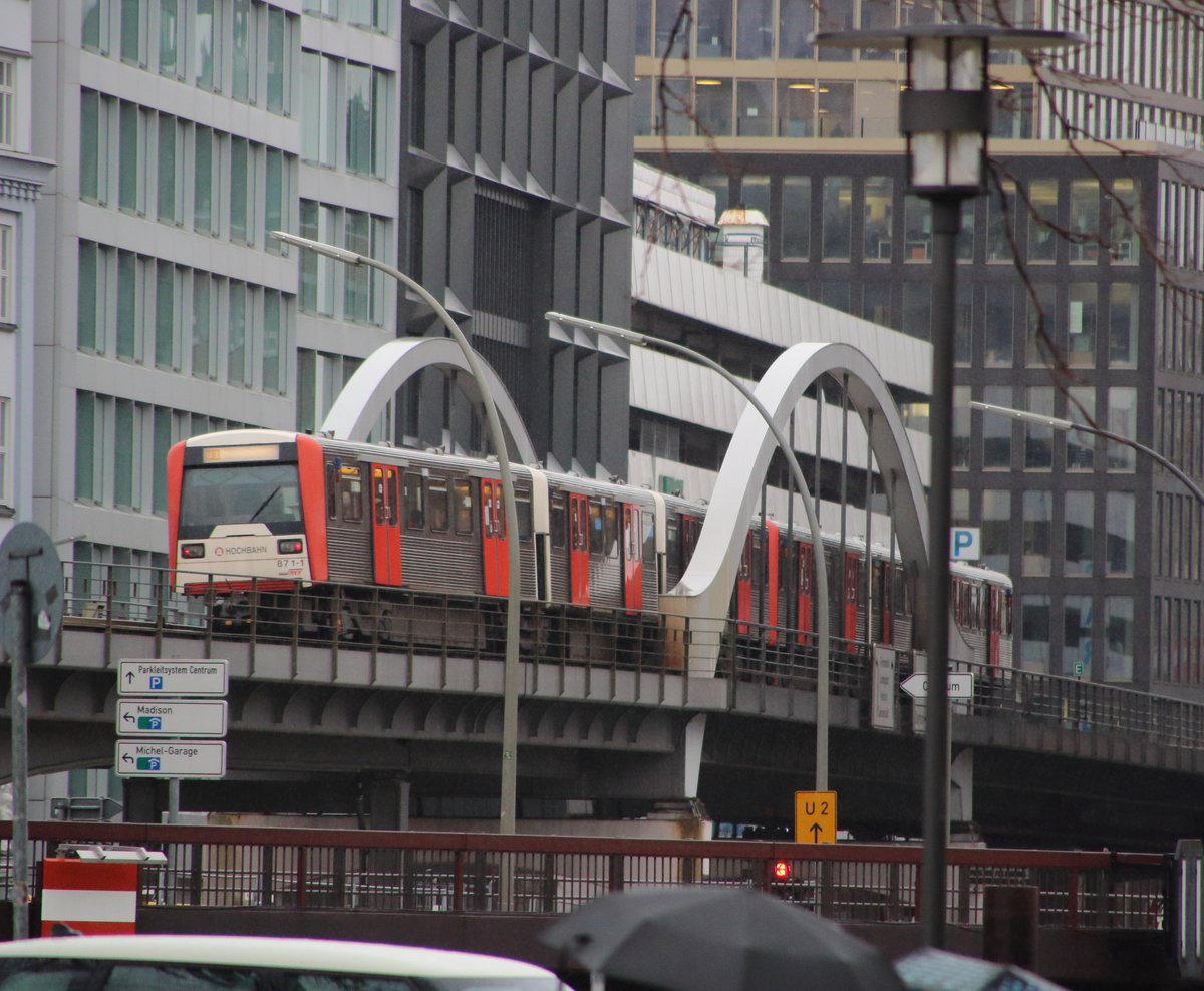 Ein Zug der Linie U3 zwischen den Stationen Baumwall und Rödlingsmarkt.
