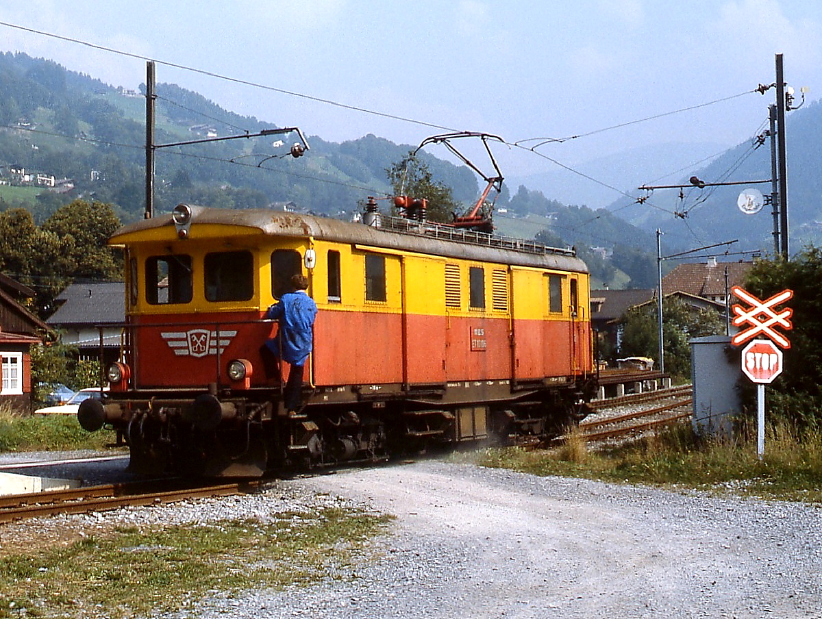 Die 1980 von der ÖBB erworbenen 1045.01 der Montafonerbahn rangiert im August 1982 im Bahnhof Schruns