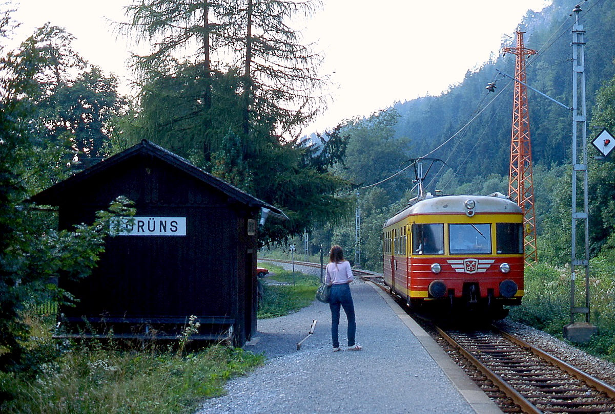 Im August 1982 trifft der ET 10.101 der Montafonerbahn (ex Bad Eisener Kleinbahn) mit dem abendlichen Personenzug nach Schruns im idyllisch gelegenen Haltepunkt Lorüns ein