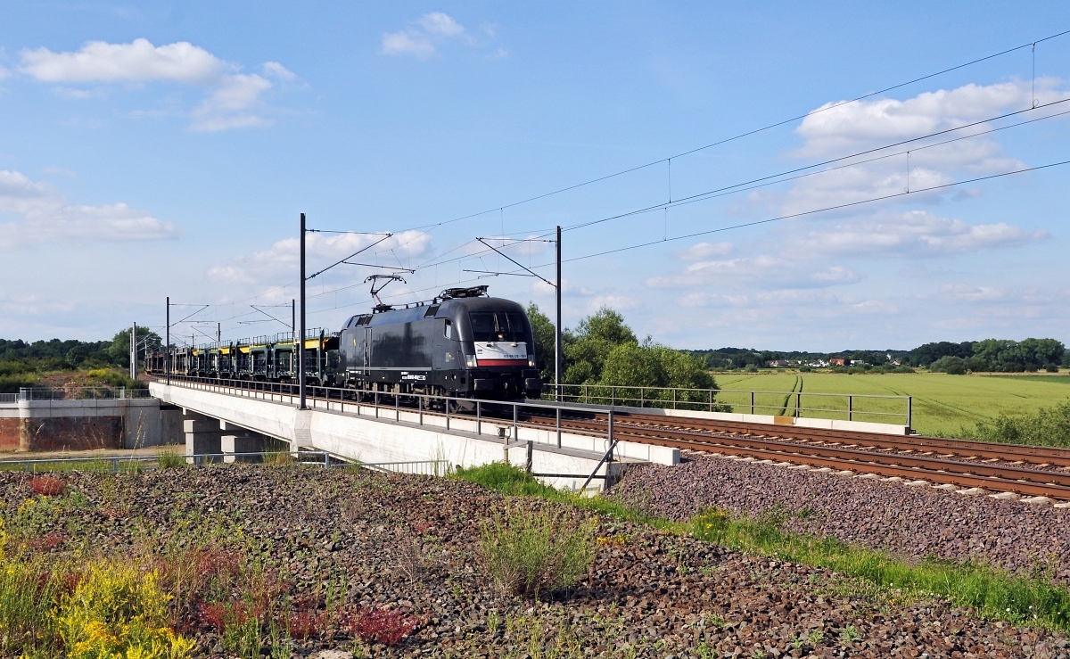 MRCE ES 64 U2-001 (182 501) fährt mit leerem Autotransportwagen am 14.06.17 bei Wahnebergen in Richtung Hannover.