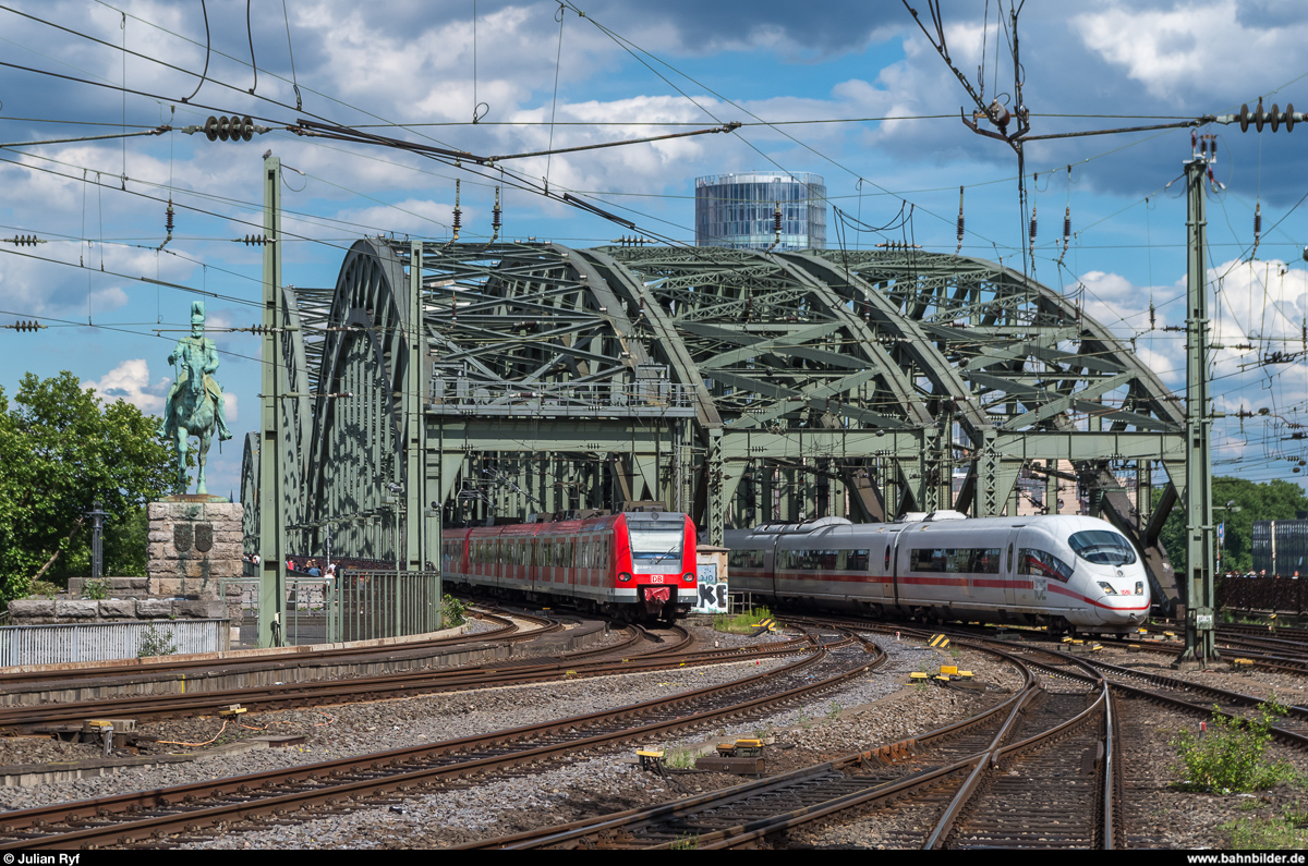 Während ein 423 gerade auf die Hohenzollernbrücke auffährt, ist ein ICE 3 in Gegenrichtung unterwegs und wird in wenigen Augenblicken in Köln Hbf anhalten.