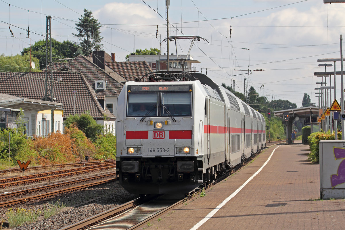 101 082-6 mit IC2201 nach Köln Hbf. überholt den RE2 nach Düsseldorf Hbf. mit 146 119-3 der mit einer technischen Störung am Zug an Gleis 2 steht in Haltern am See 26.6.2017