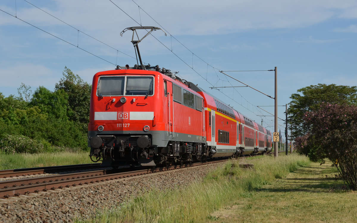 Am 28.05.17 schubst 111 127 einen Kirchentags-Sonderzug durch Greppin nach Halle(S).