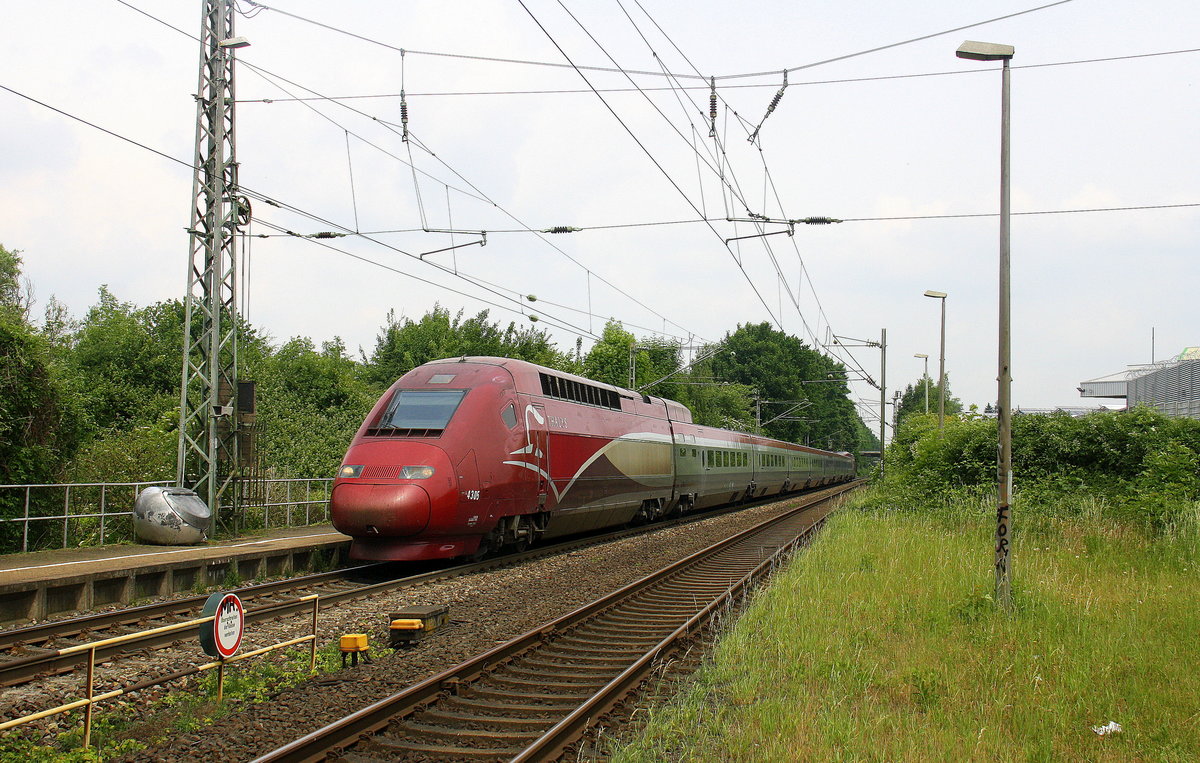 Der Thalys aus Köln-Hbf-Paris(F) kommt durch Kohlscheid als Umleiter aus Richtung Rheydt,Herzogenrath und fährt in Richtung Aachen-West,Aachen-Schanz,Aachen-Hbf und fährt die Kohlscheider-Rampe hoch.
