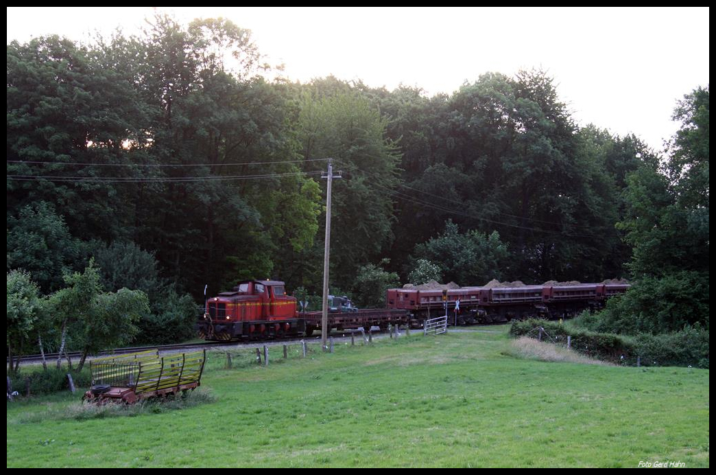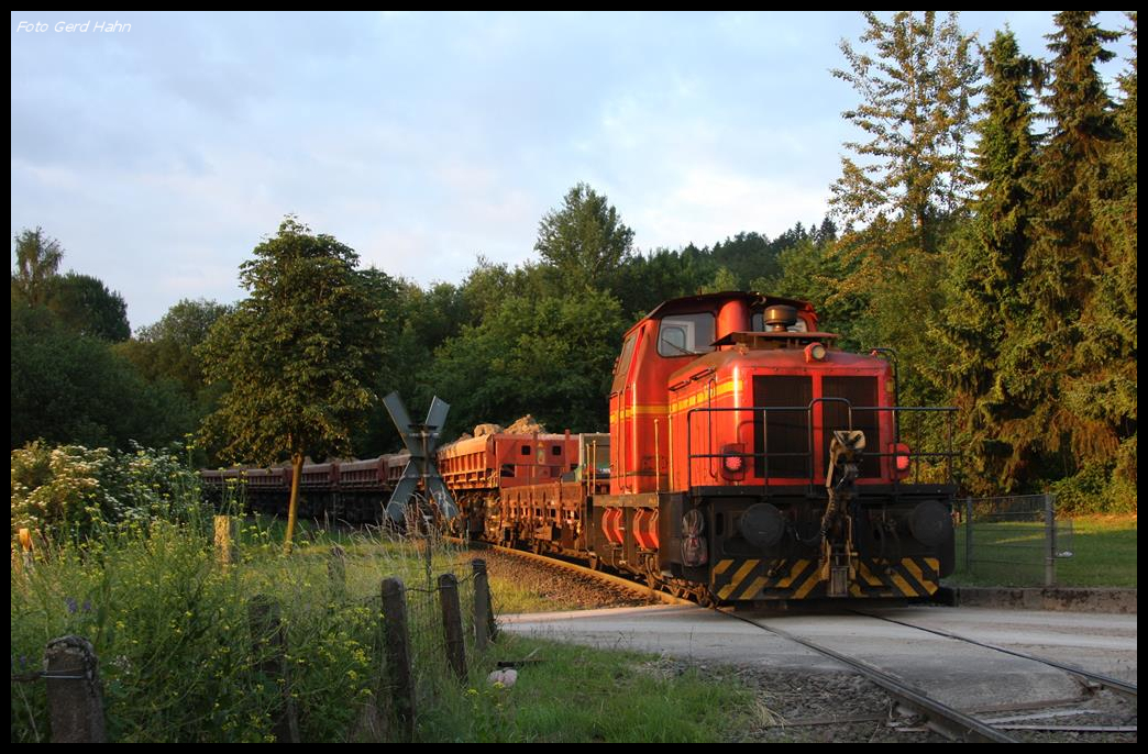 Letzte Einsatzwoche für V 60 HABA 7 auf der Hütten Bahn zwischen Hasbergen und Georgsmarienhütte. Morgens am 7.6.2017 um 06.00 Uhr ist die Lok mit ihrem Schuttzug an der Entladestelle im Augustaschacht angekommen.