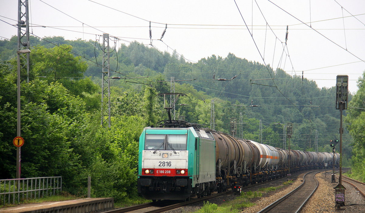 Die Cobra 2816 kommt als Umleiter aus Richtung Aachen-West mit einem langen Kesselzug aus Antwerpen-BASF(B) nach Ludwigshafen-BASF(D) und fährt durch Kohlscheid und fährt in Richtung Herzogenrath,Mönchengladbach.