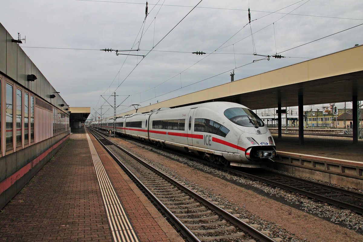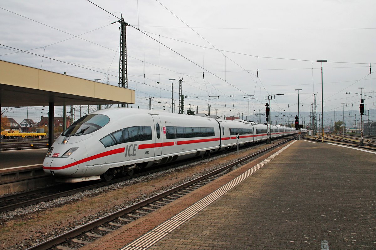 Nachschuss auf 401 002-1, der am 03.11.2015 als ICE 70 (Basel SBB - Hamburg Altona) an den Bahnsteig in Basel Bad Bf rollte.