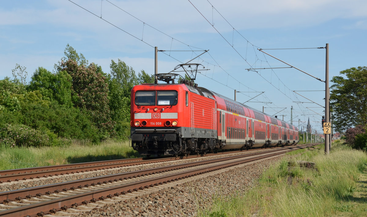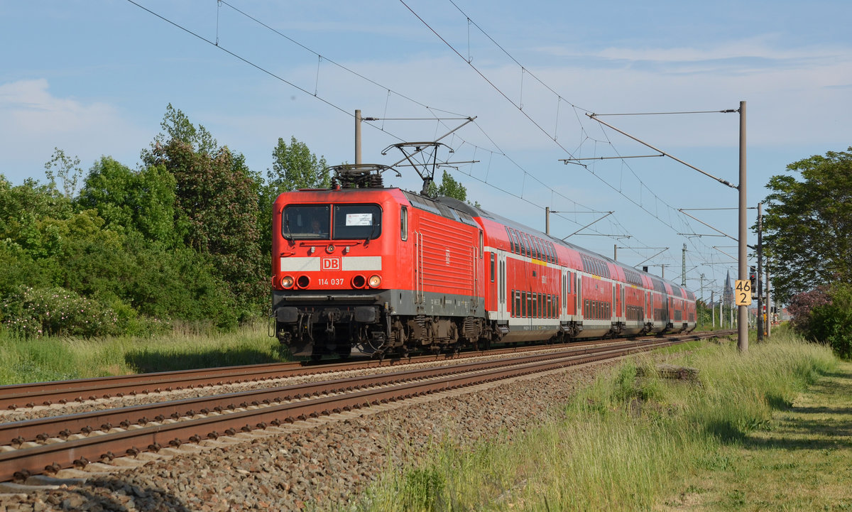 Neben 114 008 wurde auch 114 037 beim Kirchentagsverkehr eingesetzt. Hier rollt die Frankfurterin mit ihrem Dosto-Park am 28.05.17 durch Greppin Richtung Wittenberg.