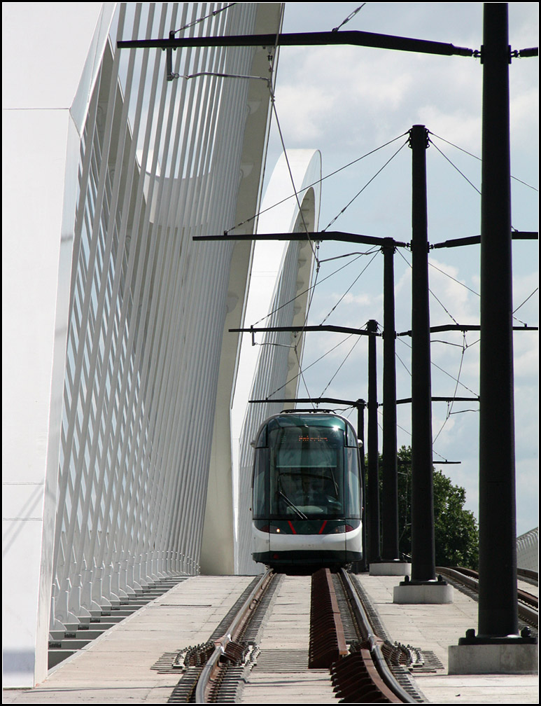 Die Verlängerung der Straßburger Tramlinie D nach Kehl führt im großen Bogen durch ein städtebauliches Entwicklungsgebiet im früheren Hafenbereich. Hier werden zwei Haltestellen noch ohne Halt durchfahren. Die Aufnahme entstand nahe der noch geschlossenen Haltestelle 'Starcoop' mit Blickrichtung Osten. Die Trasse senkt sich hier nach unten um die dortigen Bahnstrecken zu unterfahren.