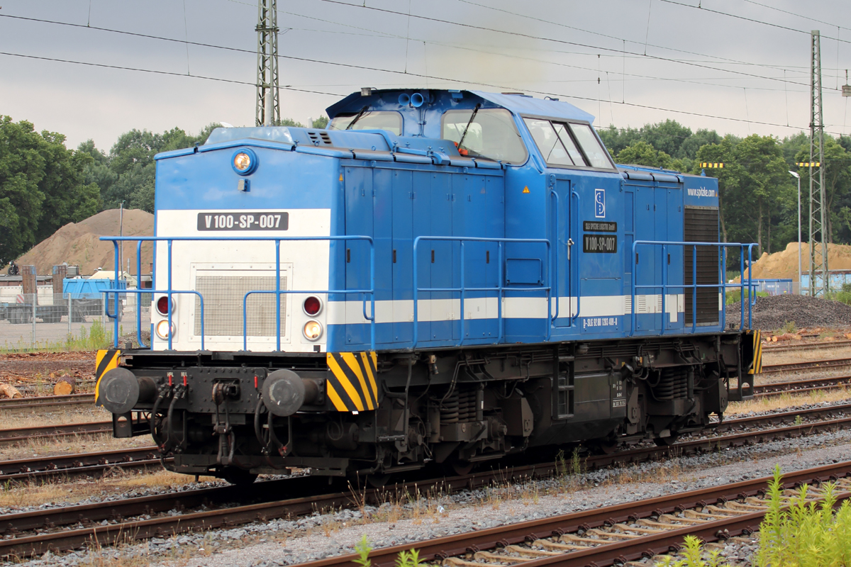 Spitzke V 100-SP-007 (203 409-8) bei Rangierarbeiten mit einem Bauzug in Haltern am See 26.6.2017