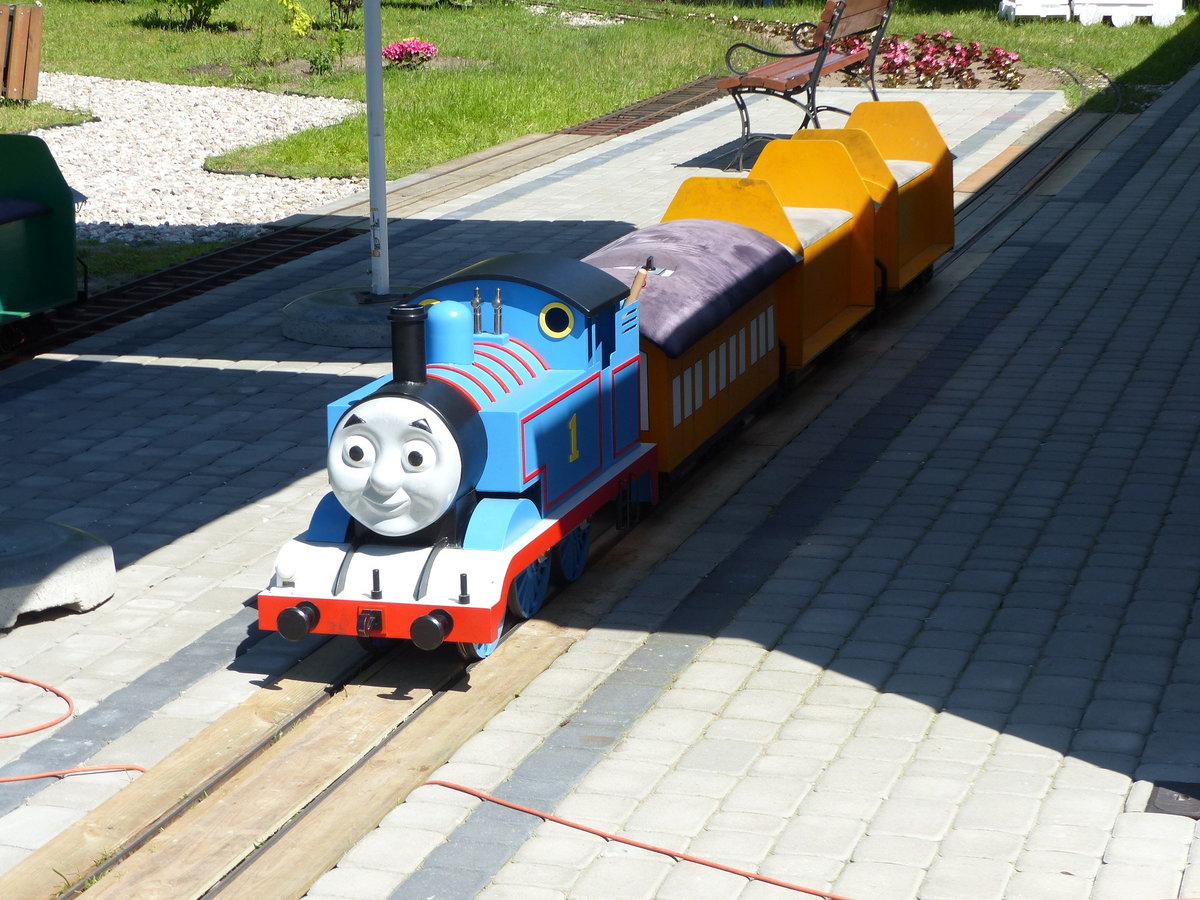 Thomas mit Wagen zum mitfahren, am 09.06.2017 im Park Miniatur i Kolejek in Dziwnów.