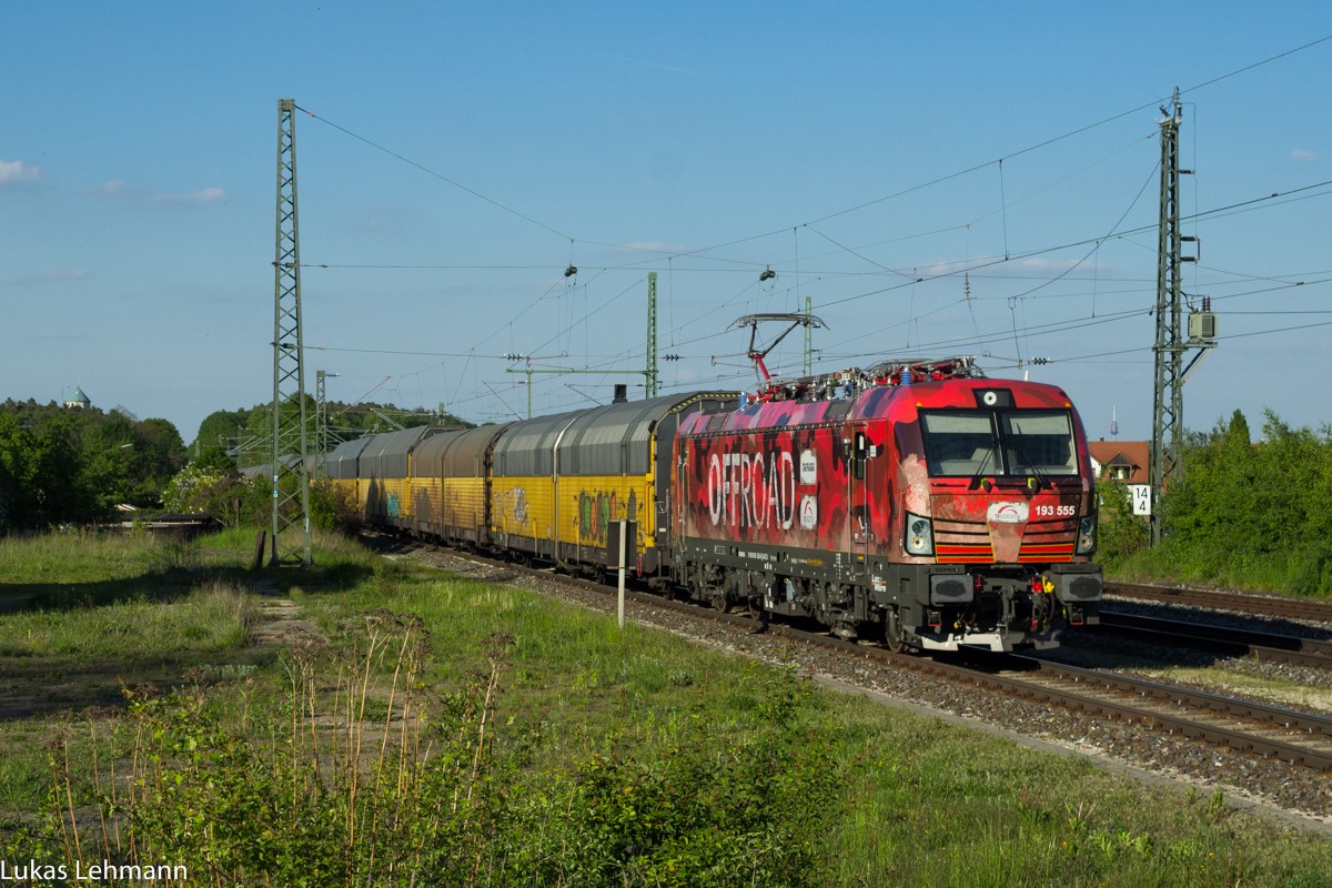 Völlig ohne Erwartungen ging es am 17.5 nach Roßtal. Ich war allerdings schon einmal dort mit einen Fotokollegen in Roßtal. Das Wetter spielte nicht sehr mit, aber der Güterverkehr war an diesem Sonntag besser als am 17.5 ;). Doch dann 10 Minuten bevor ich mich wieder Richtung Bahnhof machen wollte, hörte ich es aus Richtung Anwanden rauschen. Ich spitzelte durch die Bäume und sah was rotes. Und dann kam die 193 555 mit der Aufschrift „Offroad" vorbei. Mit dem "Bild des Tages" ging es wieder nach Hause :)