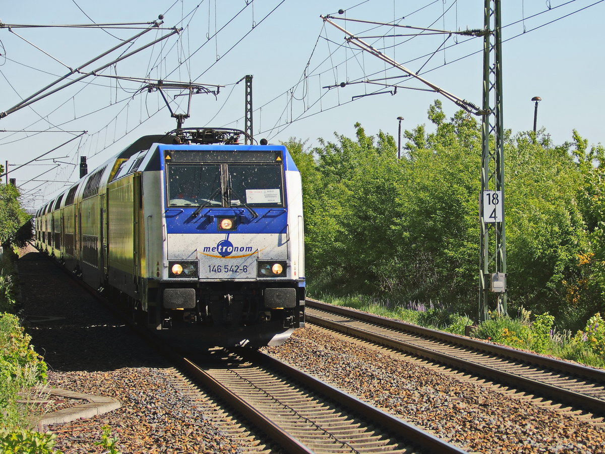 146 542-6 Metronom mit 7 Dosto (Metronom) bei einem weiteren Durchlauf in Richtung Lutherstadt Wittenberg durchfährt Gr0ßbeeren am 28. Mai 2017.