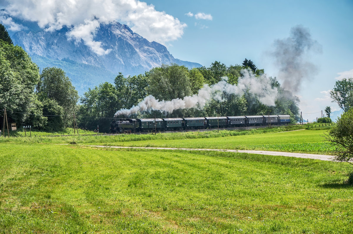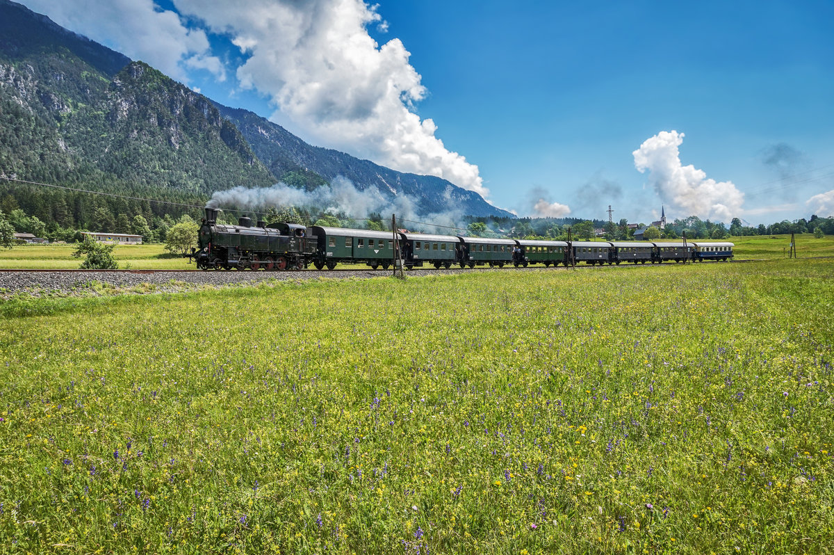93.1332 der NBiK brachte am 3.6.2017 einen Sonderzug von St. Veit a. d. Glan zum Speckfest nach Hermagor. Hier zu sehen nahe der Haltestelle Emmersdorf im Gailtal.