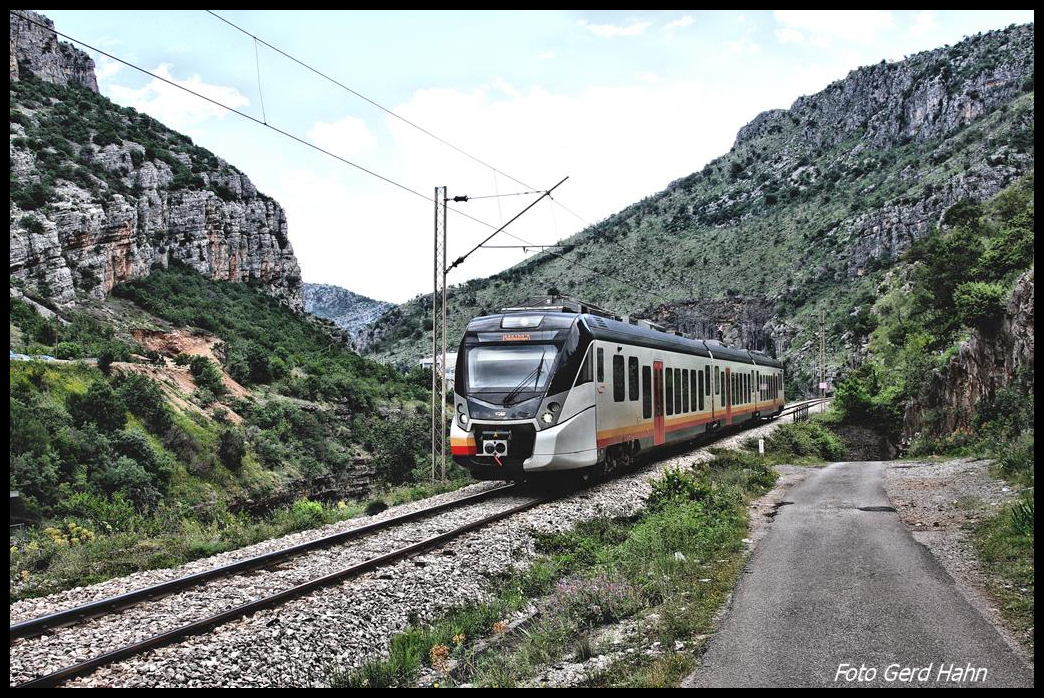 Die Nordstrecke nach Beljo Polje bzw. Belgrad führt in Montenegro in die Berge und ist nur an wenigen Stellen zugänglich. Am Stadtrand von Podgorica gab es eine solche Stelle, wo ich am 17.5.2017 den modernen ET 111009 der CAF Civity aus Beljo Polje fotografieren konnte.