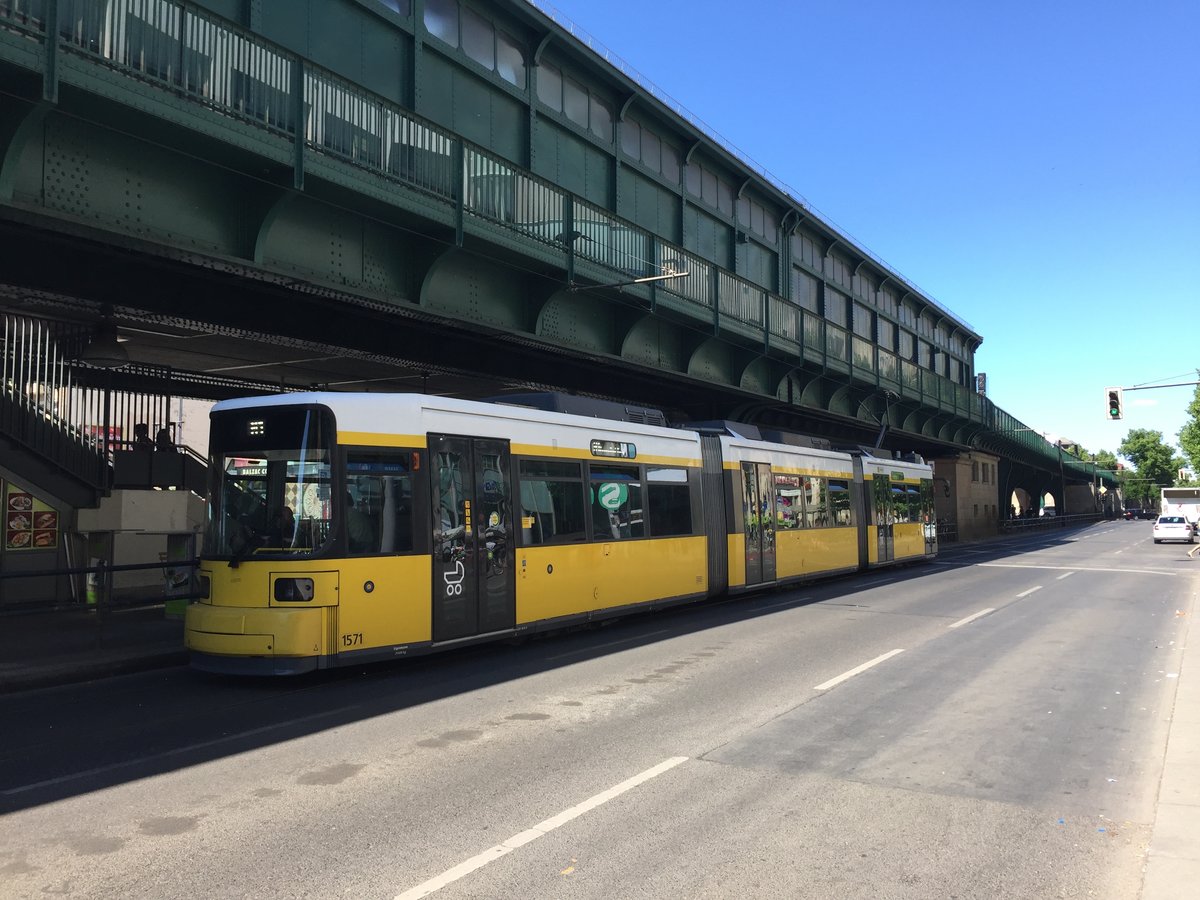 Eine Straßenbahn der Linie M1 steht am 27. Mai 2017 am S+U Schönhauser Allee.