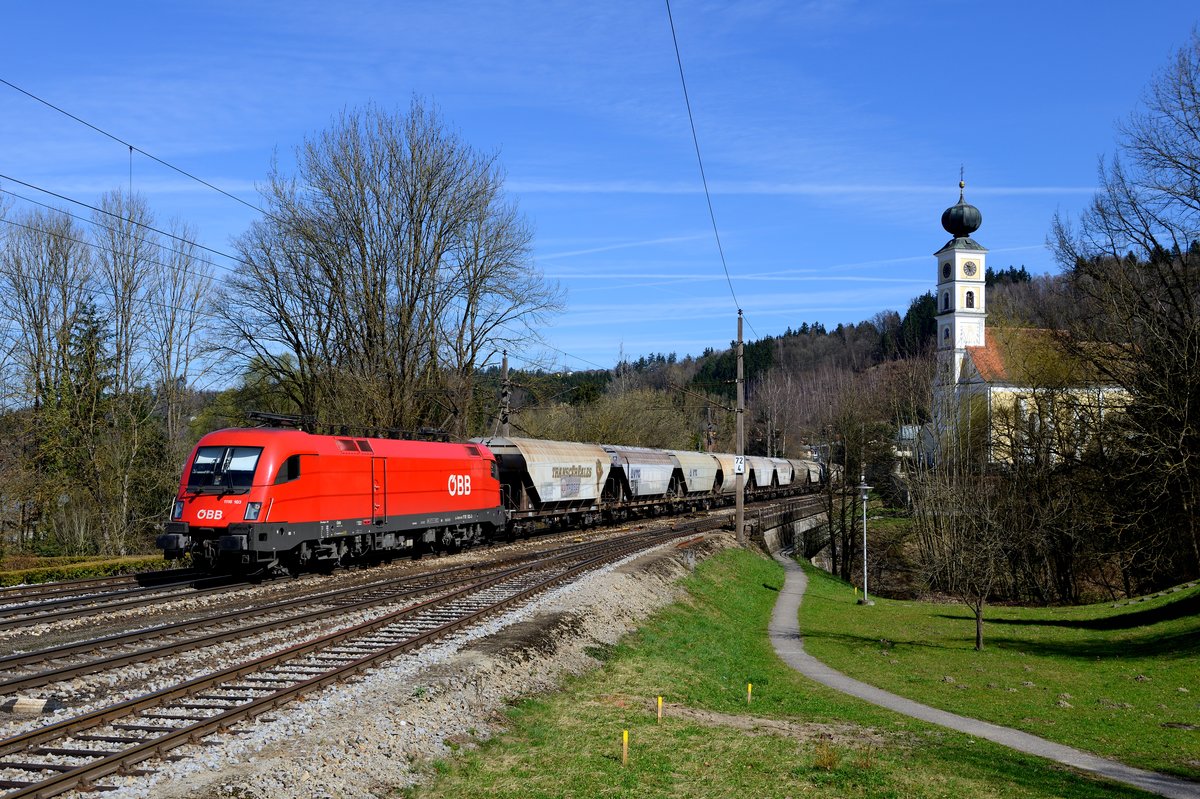 Getreidezüge sind typisch für die Donau-Achse. Zumeist werden diese jedoch von privaten EVU traktioniert. Am 26. März 2017 konnte ich jedoch einen solchen Zug mit ÖBB Bespannung in Wernstein ablichten, 1116.103 hatte den Zug in Passau abgeholt. Rechts im Bild die Pfarrkirche zum heiligen Georg, ein spätgotischer Bau aus dem Ende des 15. Jahrhunderts.