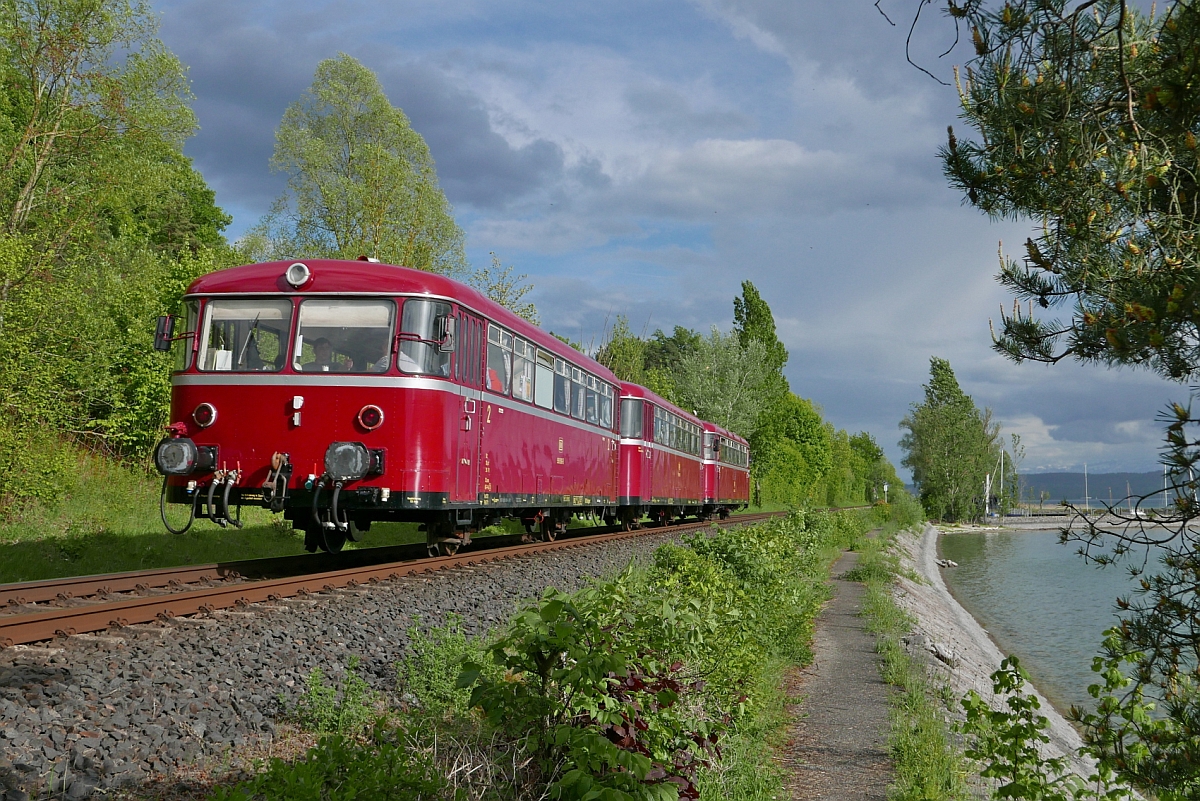 Im Rahmen eines Aktionstages von drei Verkehrsverbünden zwischen Iller, Donau, Alb und Bodensee war am 14.05.2017 auch ein mit Schienenbussen gebildeter Sonderzug unterwegs. Auf seiner 11 stündigen „Rund“-Fahrt von Ravensburg über Ulm, Sigmaringen, Tuttlingen, Singen, Friedrichshafen nach Aulendorf befinden sich 798 652, 998 069 und 998 896 kurz vor dem Bahnhof von Überlingen Therme.
